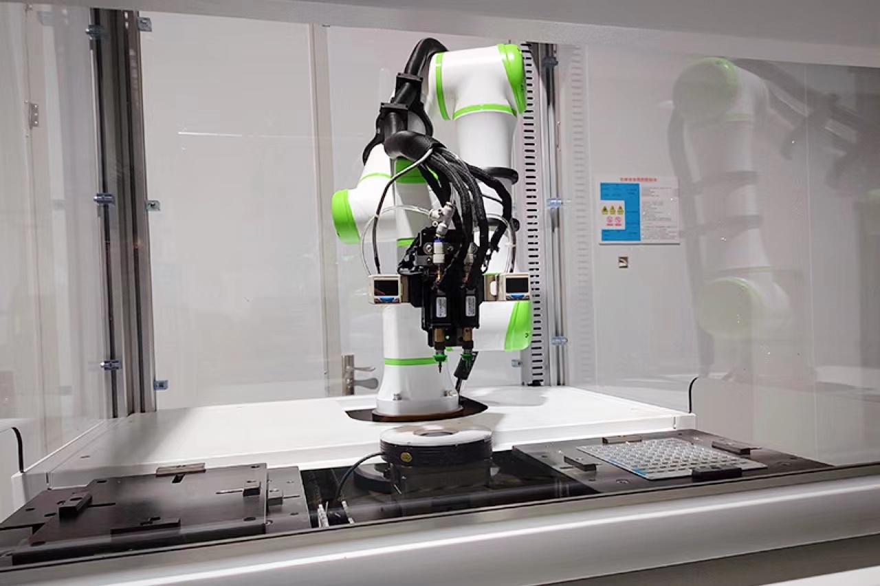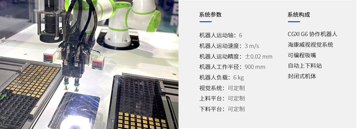 典型客户是一家全球领先的半导体集成电路制造和技术服务提供商,提供全方位的芯片成品制造一站式服务。半导体行业具备高精细度、高集成度的特征,在产品设计、制造和封装环节中,对柔性智能生产提出了更高要求,其中物料转运是衔接半导体多道加工流程的典型工序,包括前道段半导体晶圆物料,后道段晶圆盒、芯片弹画、托盘转运等,非常适合机器人作业。本项目采用G6协作机器人完成了芯片外壳的转运,此道转运工序直接关系到生产效率,对时间节拍要求到了极致。